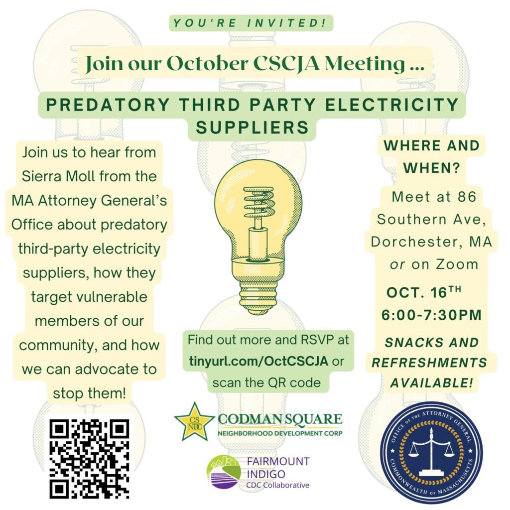 Join us, our member-CDC, Codman Square Neighborhood Development Corporation, and representatives from the Attorney General’s Office to learn about third-party electricity suppliers, their predatory practices in the community, and how […]